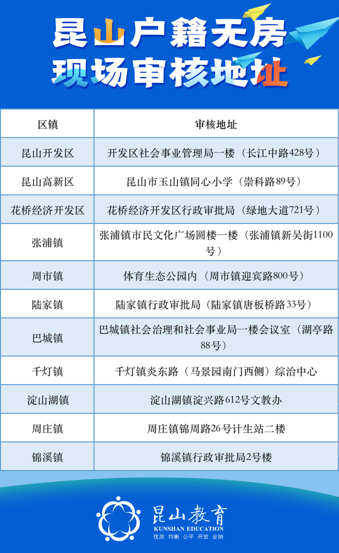 在本市无合法固定住所(本意见特指具有住宅房屋所有权证的居住用房,商业、办公、工业用房、车库等非居住用房除外,下同)的昆山户籍人员子女入学报名,父母或其他法定监护人从网上报名系统中打印《昆山市中小学招生入学报名表(户籍生)》,确认相关报名信息后,于6月11日持身份证、户籍证明、婚姻状况证明、工作单位证明、婴儿出生证(小学)和租房合同等材料到各区镇(地址见附件)现场审核,由教育局会同各区镇根据工作单位和实际居住地等情况统筹安排。