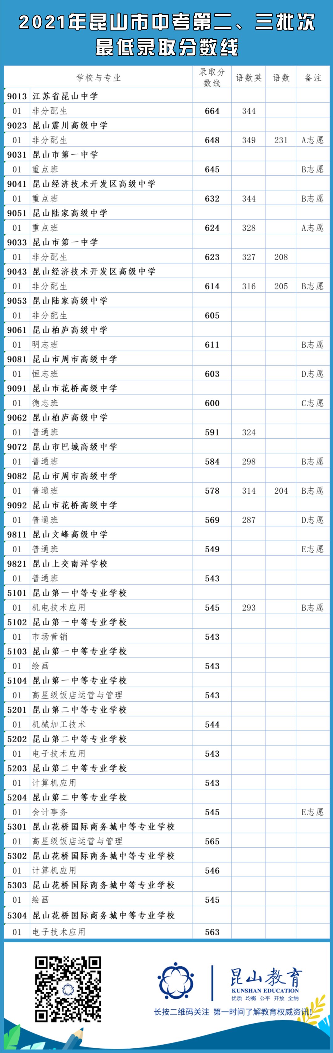 2021年昆山市中考第二、三批次最低录取分数线:
