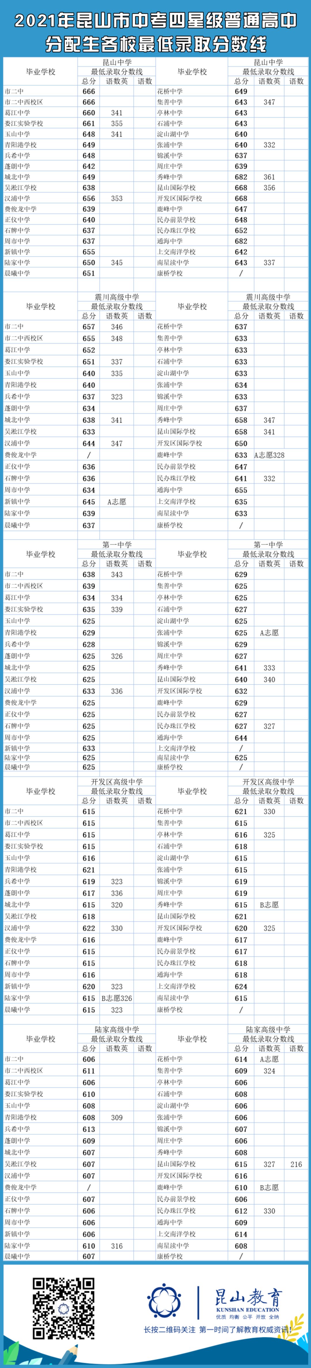 2021昆山中考各学校最低录取分数线公布