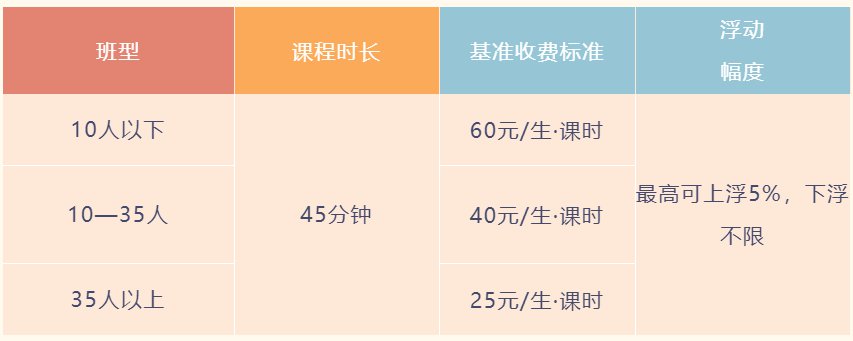 (二)各培训机构在基准收费标准和浮动幅度内,确定具体收费标准。其中:45分钟为标准课程时长,实际时长不一样的,按比例折算。