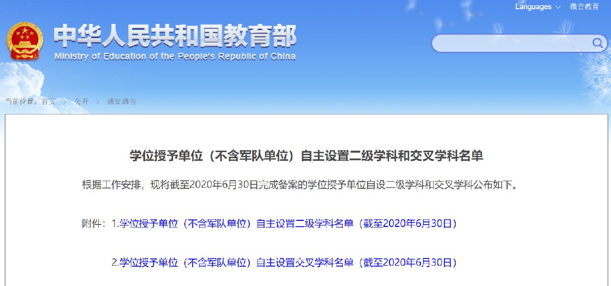 2020年8月27日,教育部公布了最新学位授予单位(不含军队单位)自主设置二级学科和交叉学科名单: