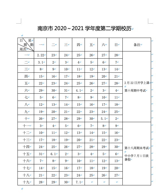 2020年8月30日教师到校,8月31日学生报到,9月1日开学上课。第十一周期中考试,第二十一周期末考试。
