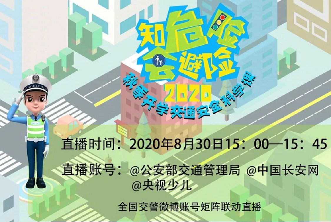 由公安部交通管理局主办,公安部道路交通安全研究中心、北京市公安局公安交通管理局、中央广播电视总台央视少儿频道、中国少年儿童新闻出版总社、中国交通频道联合承办的“交通安全云课堂”之“知危险 会避险”2020秋季开学交通安全科学课将在8月30日15:00在线直播 ,全国交警微博账号矩阵联动直播,敬请关注。