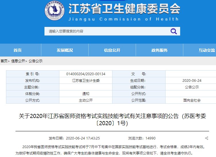 根据《关于2020年江苏省医师资格考试实践技能考试有关注意事项的公告》(苏医考委〔2020〕1号):