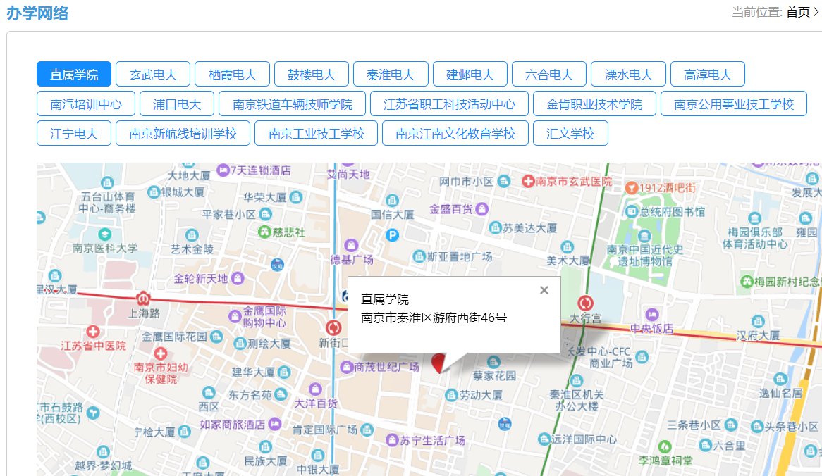 分别是:直属学院、建邺电大、秦淮电大、汇文学校、鼓楼电大、江苏省职工科技活动中心、南京公用事业技工学校、南京江南文化教育学校、玄武电大、南汽培训中心、浦口电大、栖霞电大、江宁电大、南京铁道车辆技师学院、南京工业技工学校、南京新航线培训学校、六合电大、金肯职业技术学院、溧水电大、高淳电大。