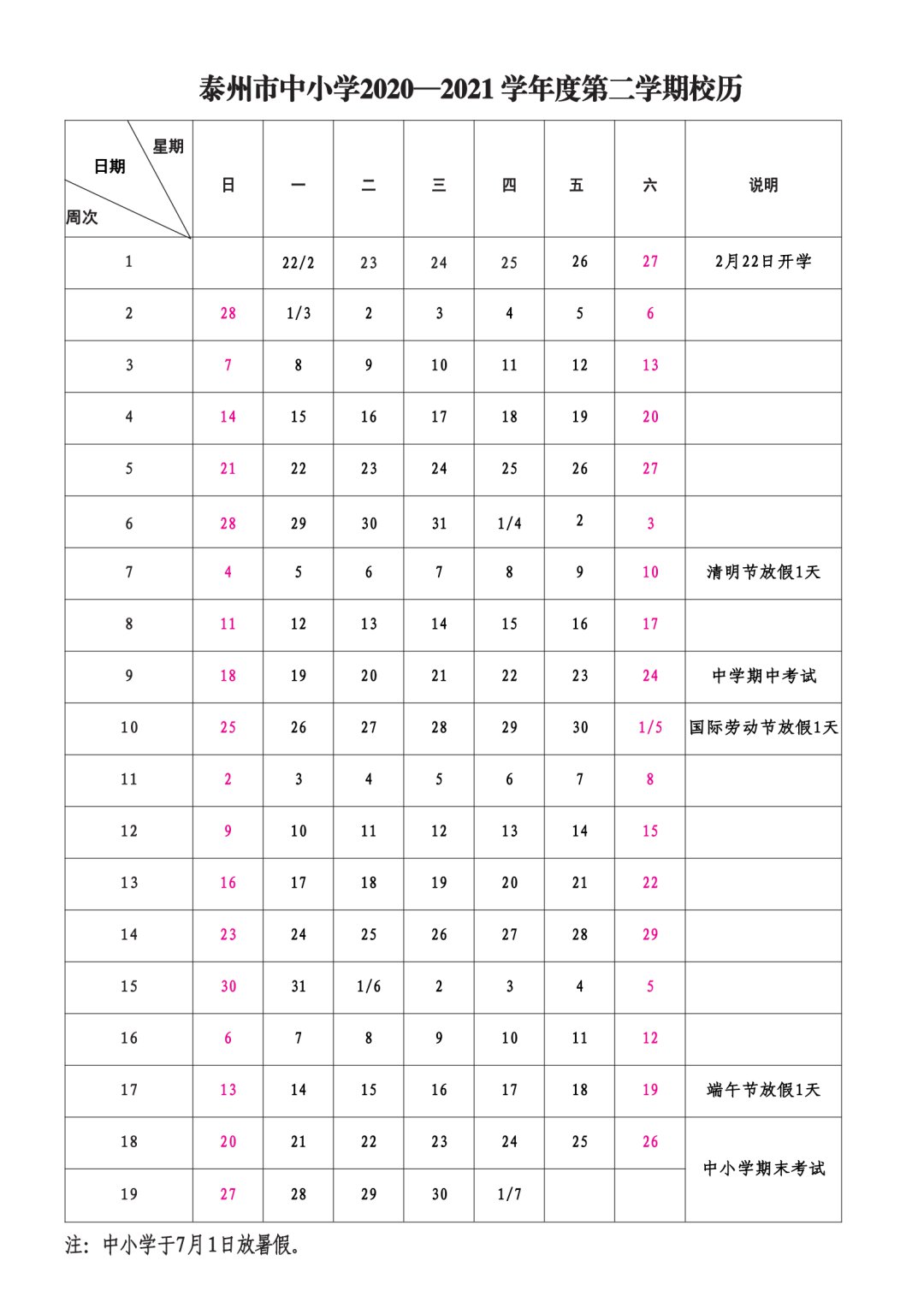 泰州市学校2020至2021学年校历(泰州市2021-2022校历)