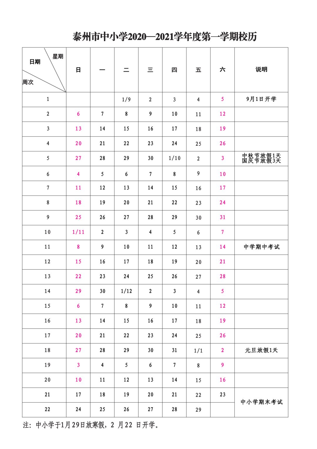 泰州市中小学2020—2021学年度第一学期校历: