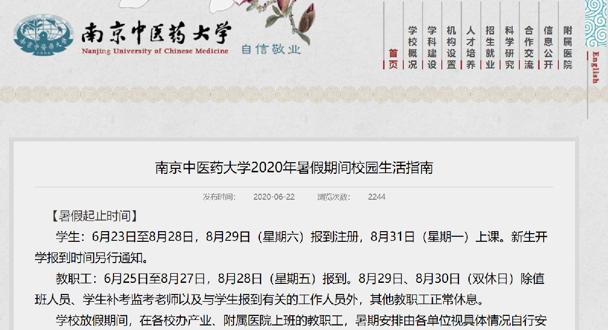 南京中医药大学已经发布2020年暑假放假时间通知:
