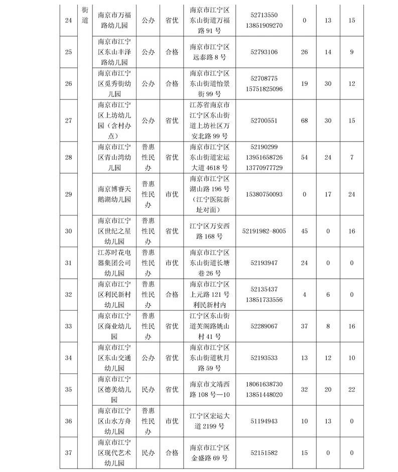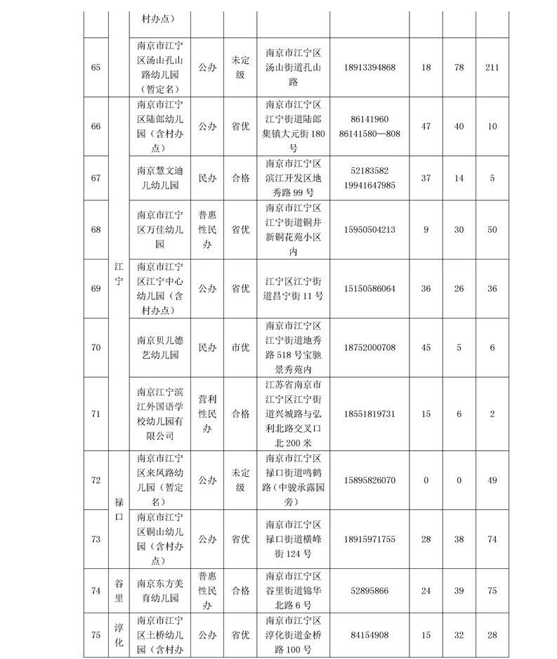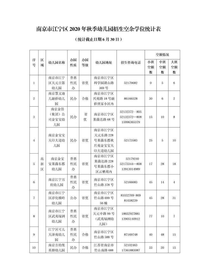 江宁区2020年幼儿园招生空余学位(截止6月30日):
