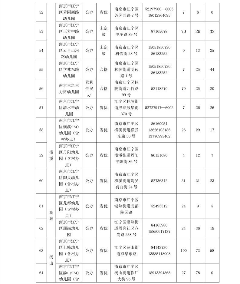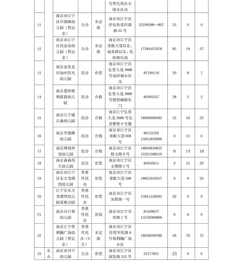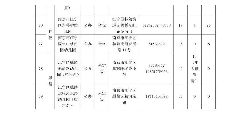 江宁区2020年秋季幼儿园招生空余学位(截止6月30日)已经公布,详情如下:
