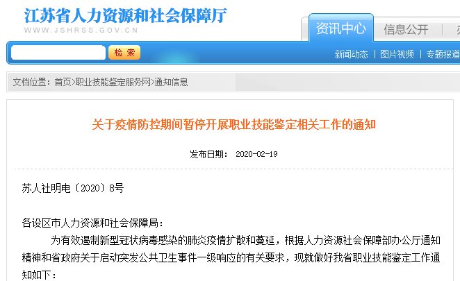 江苏于2020年1月30日发布《关于疫情防控期间暂停开展职业技能鉴定相关工作的通知》: