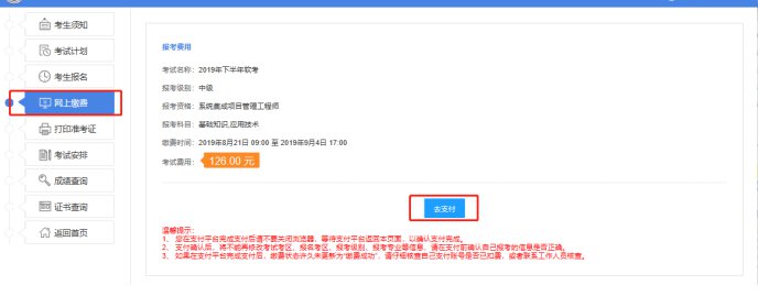 第九步:点击网上缴费,确认信息,无误即可点击去支付(仅支持支付宝支付)。