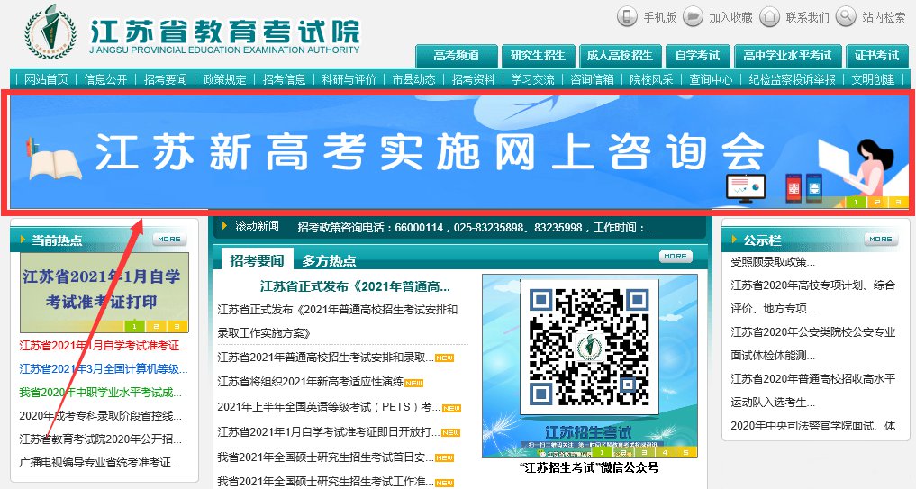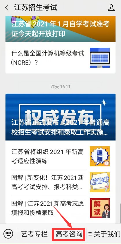2.手机端:关注“江苏招生考试”微信公众号,点击下方菜单栏“高考咨询”按钮进入。