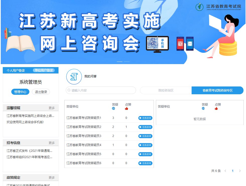 2020年12月29日起,为帮助考生、家长答疑解惑,江苏省教育考试院安排了“江苏新高考实施网上咨询会”。