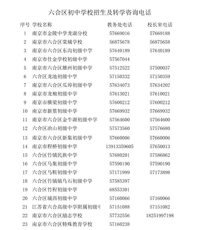 2020年南京六合区初中招生政策暂未出炉。以下为六合区各初中咨询电话: