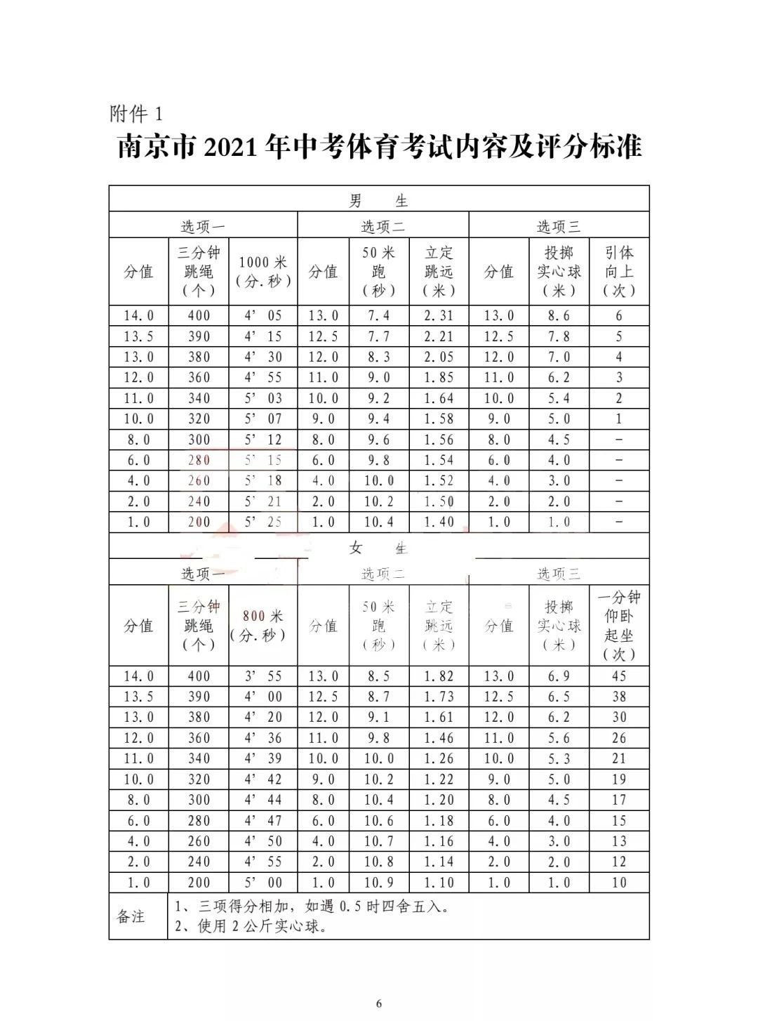 附件1:南京市2021年中考体育考试内容及评分标准