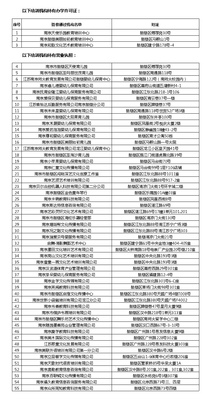 按照省市疫情防控指挥部统一部署,近期鼓楼区联防联控工作指挥部学校组组织相关部门和属地街道对已申请复课的社会培训机构(托育机构)进行了督查验收,现将第五批通过验收的社会培训机构(托育机构)名单公示如下: