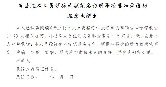报考人员在“全国专业技术人员资格考试报名服务平台(http://zg.cpta.com.cn/examfront/)填报相关信息后,系统生成《专业技术人员资格考试报名证明事项告知承诺制报考承诺书》(电子文本),报考人员由本人签署(提交)承诺书,不允许代为承诺。