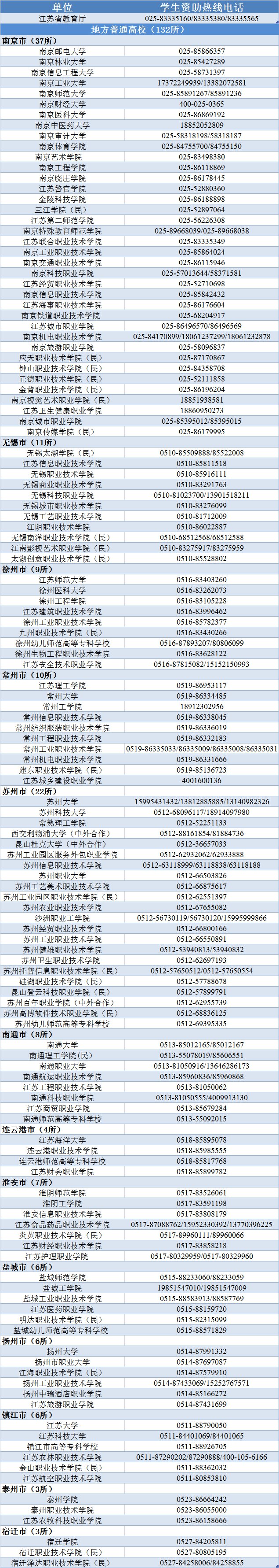 江苏省教育厅及地方高校学生资助热线电话: