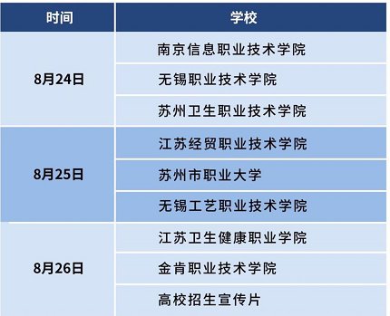 直播现场,南京信息职业技术学院、无锡职业技术学院、苏州卫生职业技术学院、江苏经贸职业技术学院、苏州市职业大学、无锡工艺职业技术学院、江苏卫生健康职业学院、金肯职业技术学院等多所知名高职院校的招生负责人将走进演播室,全面介绍学校的办学特色、硬核学科和王牌专业,为考生和家长填报志愿支招。其中,不乏国家“双高计划”建设院校、国家示范性高职院校、江苏省高水平高职院校等。