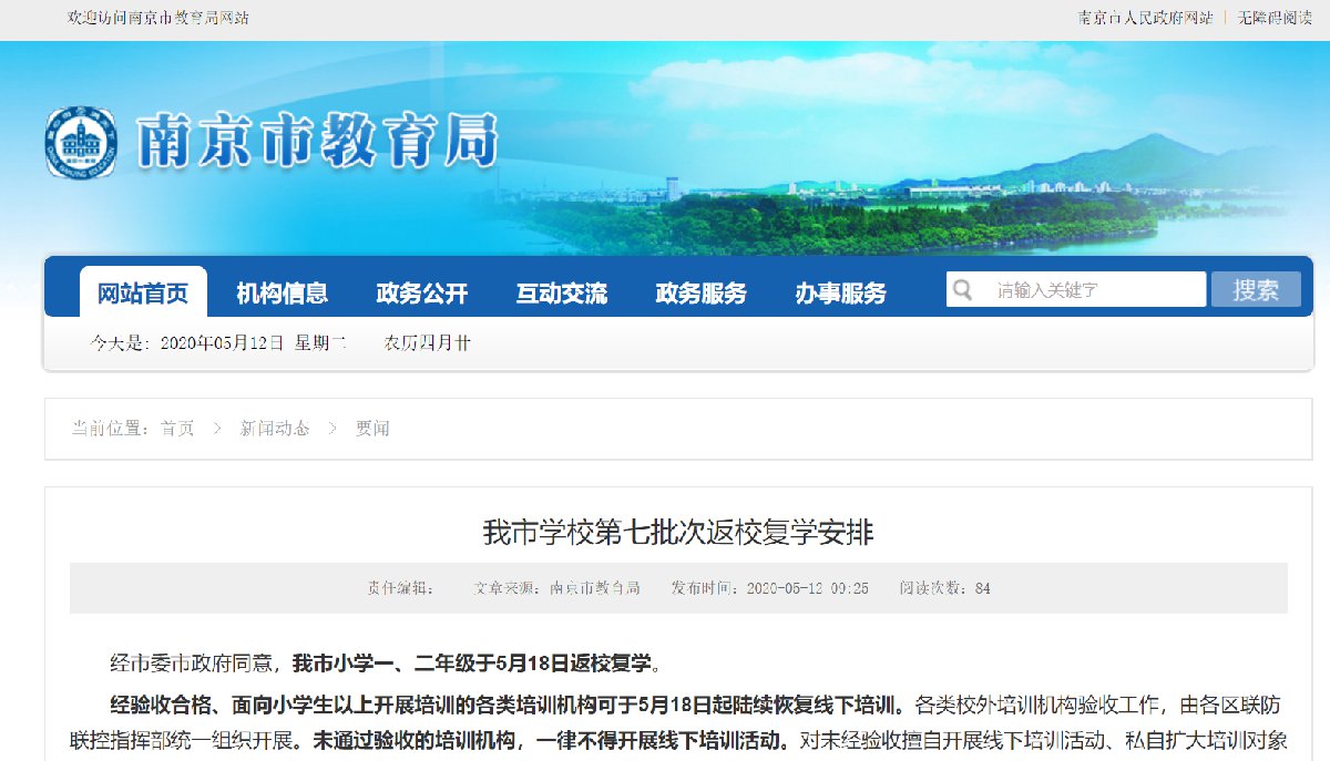 2020年5月12日,南京教育局公布南京市学校第七批次返校复学安排,确定小学一、二年级开学时间: