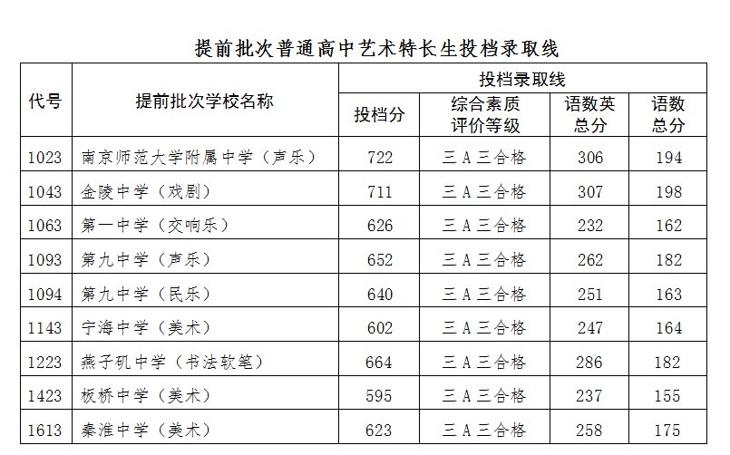 原市区普通高中指标生投档控制线为576分,由本区教育局划定的指标生投档控制线为:江浦高级中学、六合高级中学、六合实验高级中学557分,江宁高级中学、秦淮中学、临江中学、天印高级中学560分,溧水高级中学577分,高淳高级中学562分。