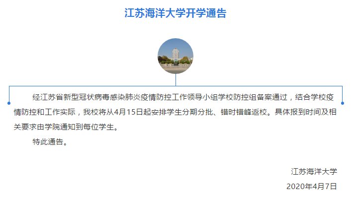 2020江苏海洋大学开学通告(江苏海洋大学2020寒假放假时间)