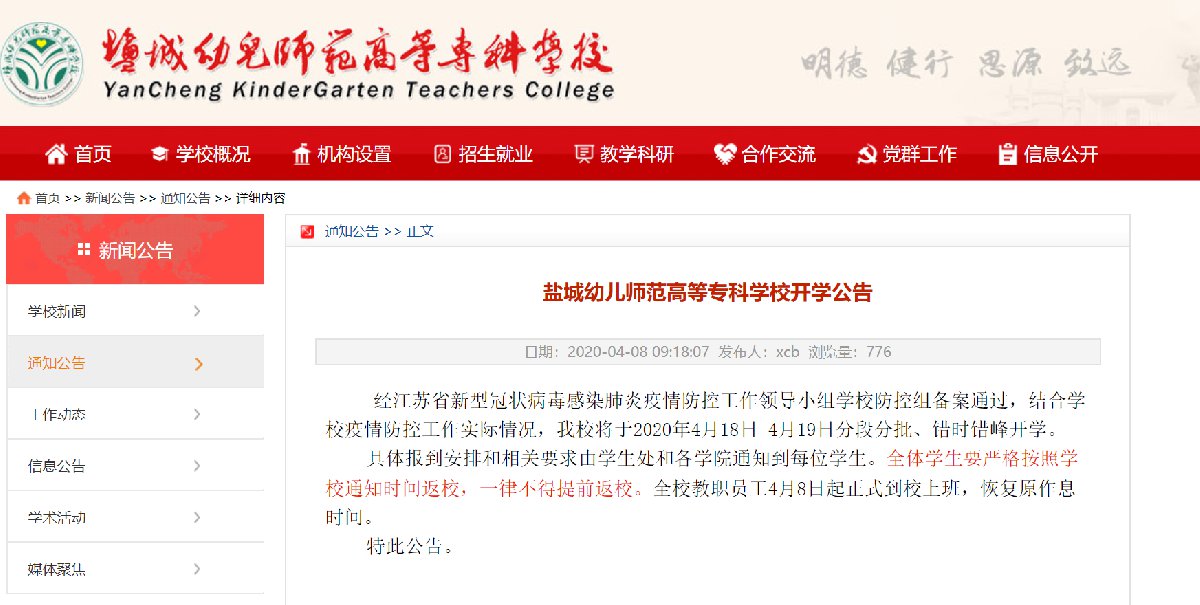 经江苏省新型冠状病毒感染肺炎疫情防控工作领导小组学校防控组备案通过,结合学校疫情防控工作实际情况,我校将于2020年4月18日-4月19日分段分批、错时错峰开学。