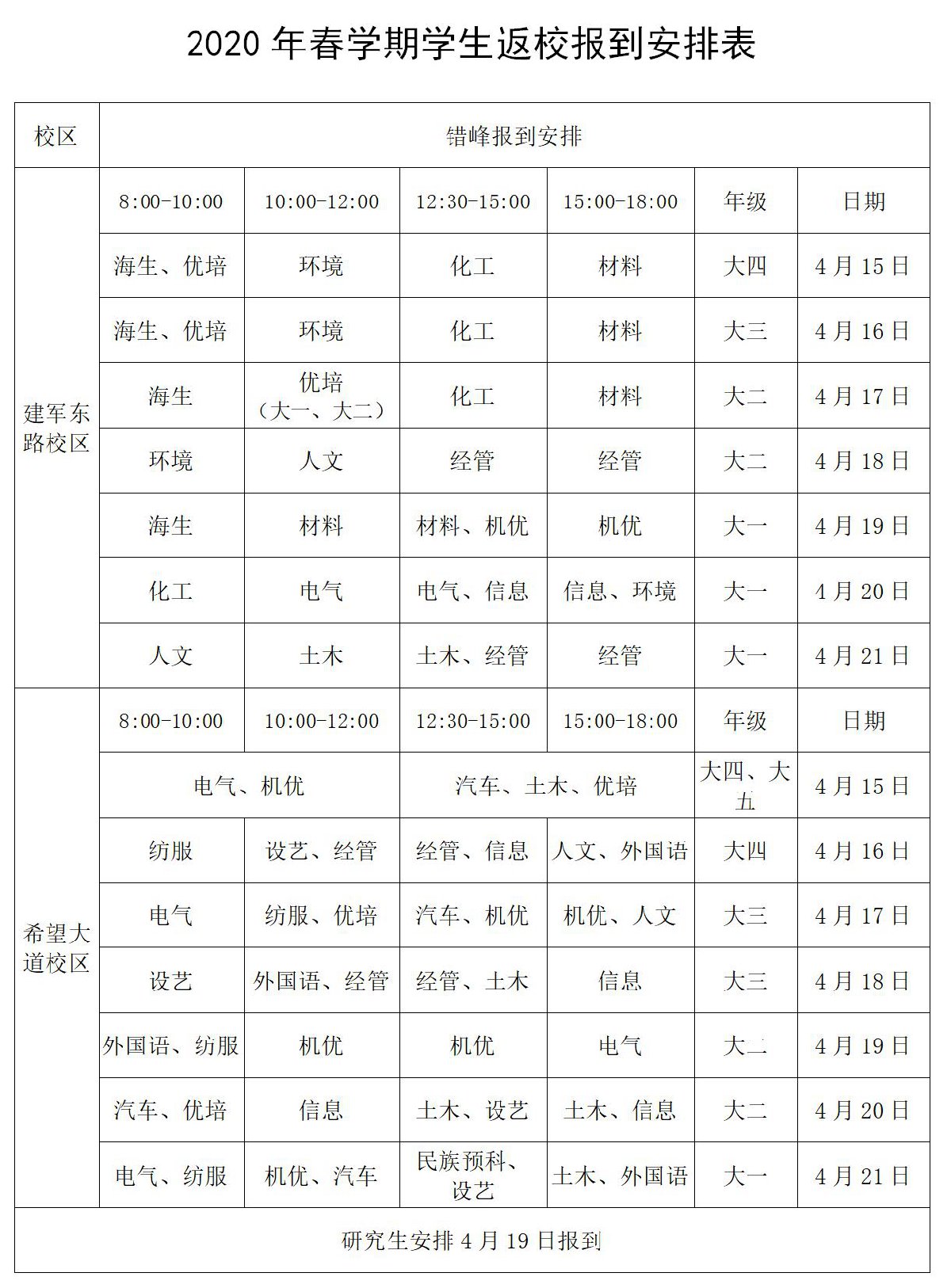 学校采取分类、分学院、分时返校,学生凭学院出具的“同意返校证明”返校报到。具体返校时间以下表为准,请同学们接到返校通知后,合理安排返校行程,并报学院统计。