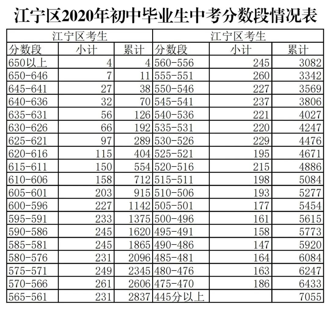 南京江宁区2020年中考分数段统计表一览