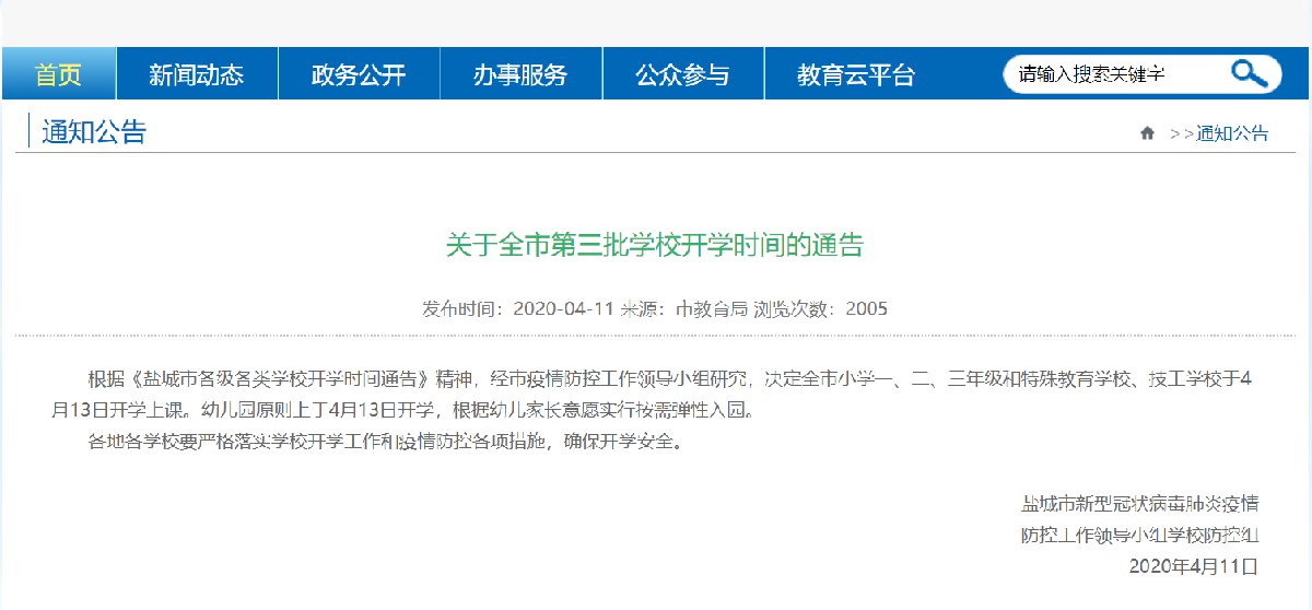 根据《盐城市各级各类学校开学时间通告》精神,经市疫情防控工作领导小组研究,决定全市小学一、二、三年级和特殊教育学校、技工学校于4月13日开学上课。幼儿园原则上于4月13日开学,根据幼儿家长意愿实行按需弹性入园。