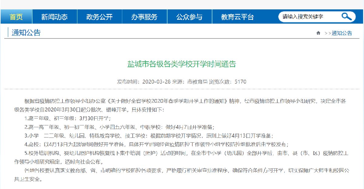 盐城市中小学2020春季开学时间已经全部公布,教育局通知如下: