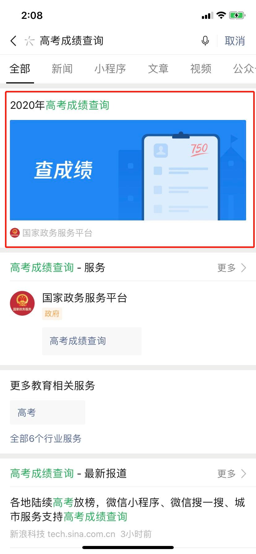 考生可通过微信搜一搜(打开微信-发现-搜一搜)搜索“国家政务服务平台”小程序,在首页找到“高考成绩查询”服务进行查询,或者直接使用微信搜一搜搜索“高考成绩查询”也可进入“国家政务服务平台”小程序专区查询。