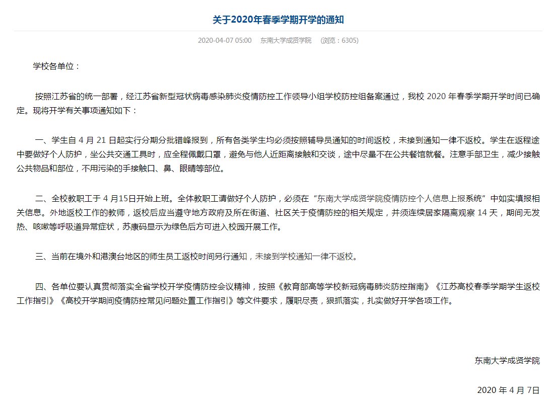 东南大学成贤学院开学时间2020(东南大学成贤学院开学时间2021最新消息)