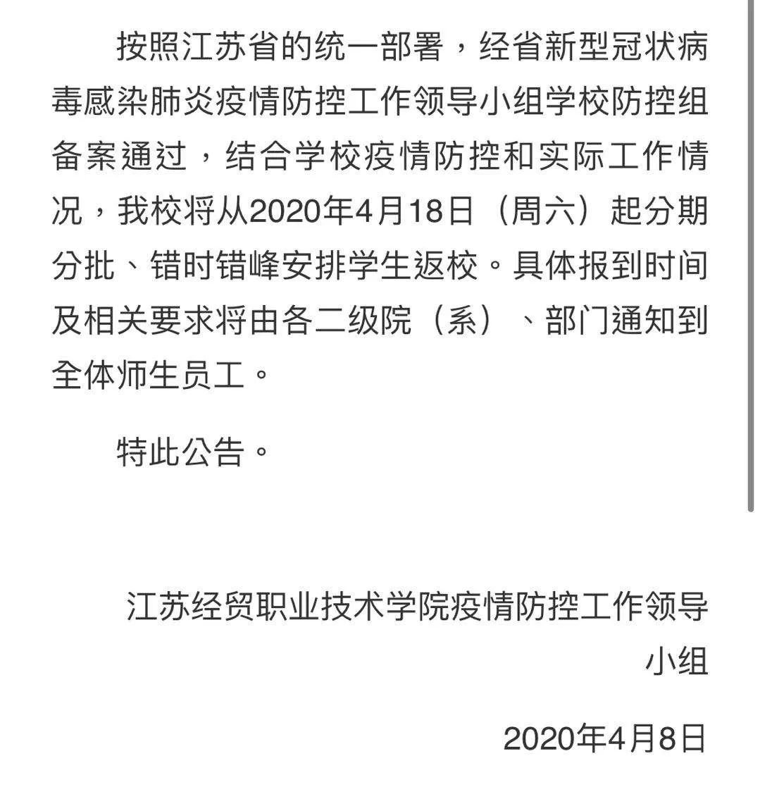 2020年4月18日(周六)起分期分批、错时错峰安排学生返校。