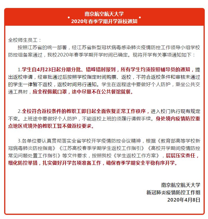 南京航空航天大学2020年开学时间(南京航空航天大学开学日期2020)