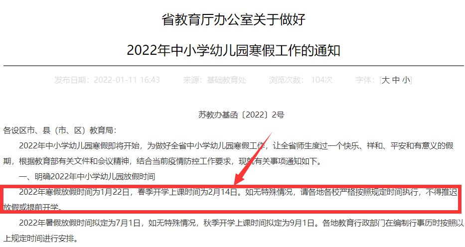 根据2022年1月11日江苏省教育厅发布的《省教育厅办公室关于做好2022年中小学幼儿园寒假工作的通知》可知:
