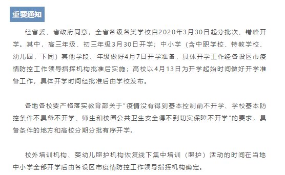 经省委、省政府同意,全省各级各类学校自2020年3月30日起分批次、错峰开学。其中: