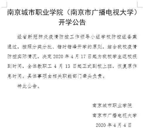 经江苏省新型冠状病毒感染肺炎疫情防控工作,领导小组学校防控组备案通过,结合疫情防控实际情况,南京一批高校确定开学时间。