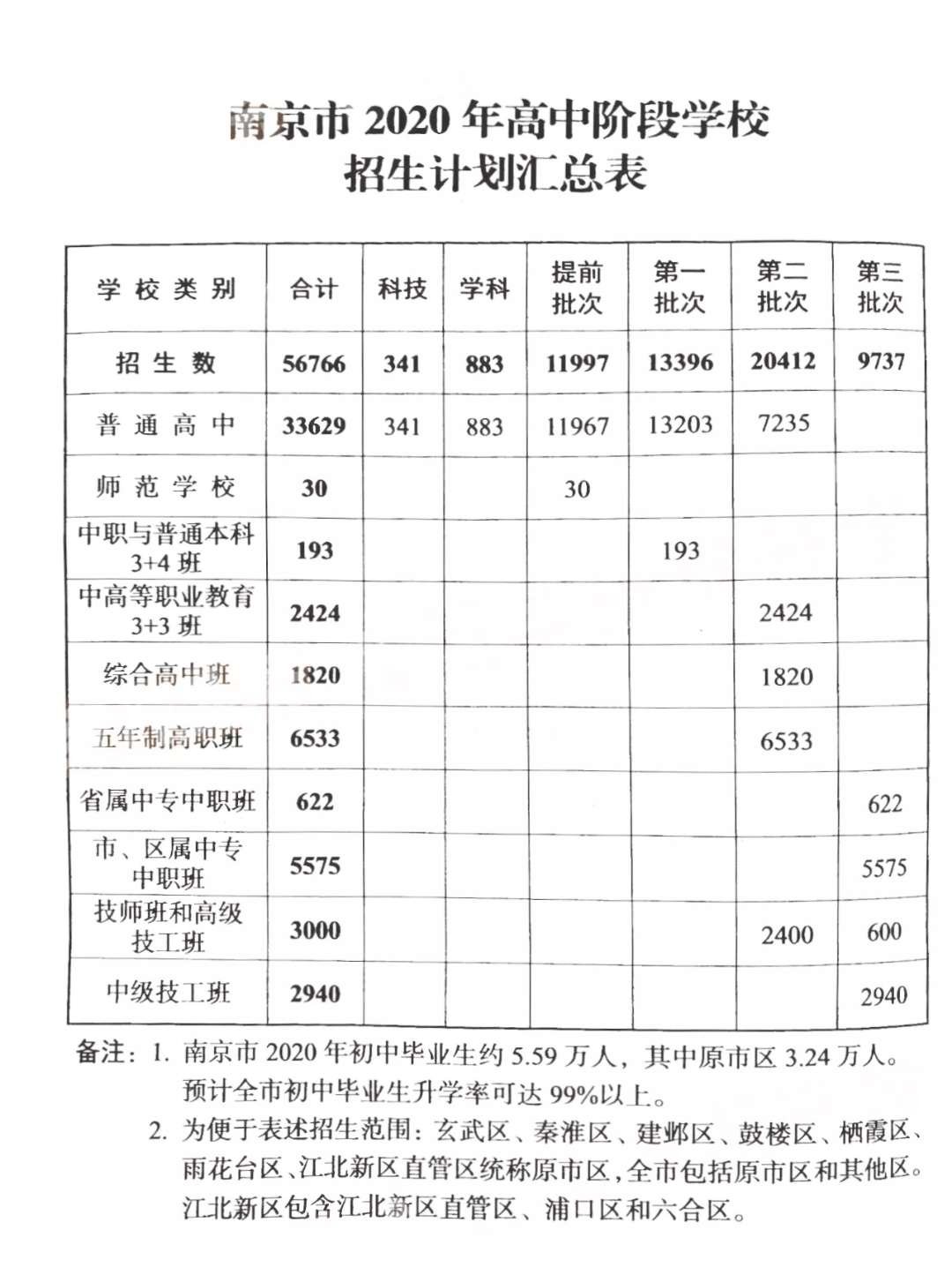 南京普高招生计划2020年共计33490人,其中普通生18869人,指标生10916人,科技生341人,学科生883人,体育生289人,艺术生397人,国际班1795人。