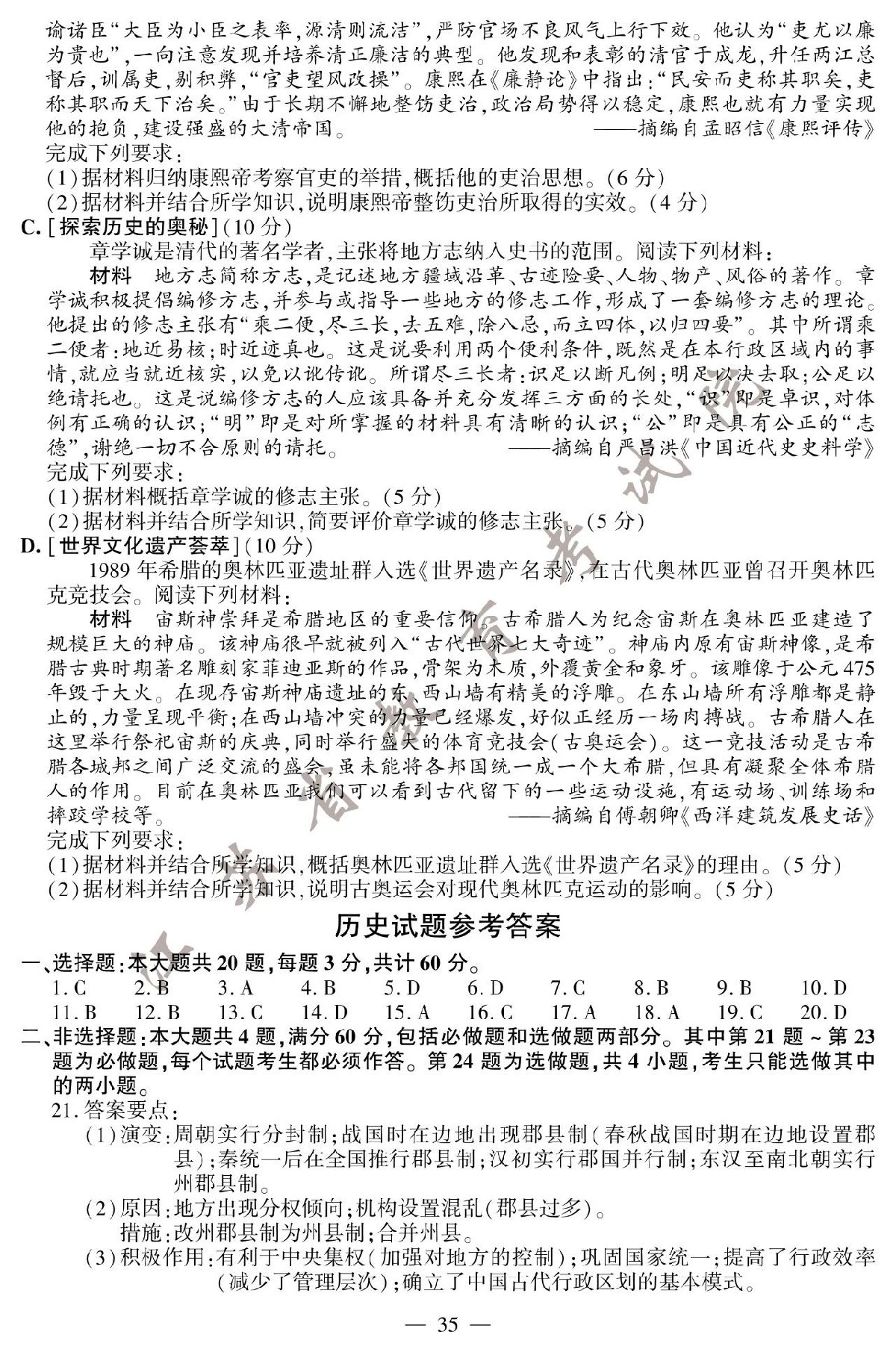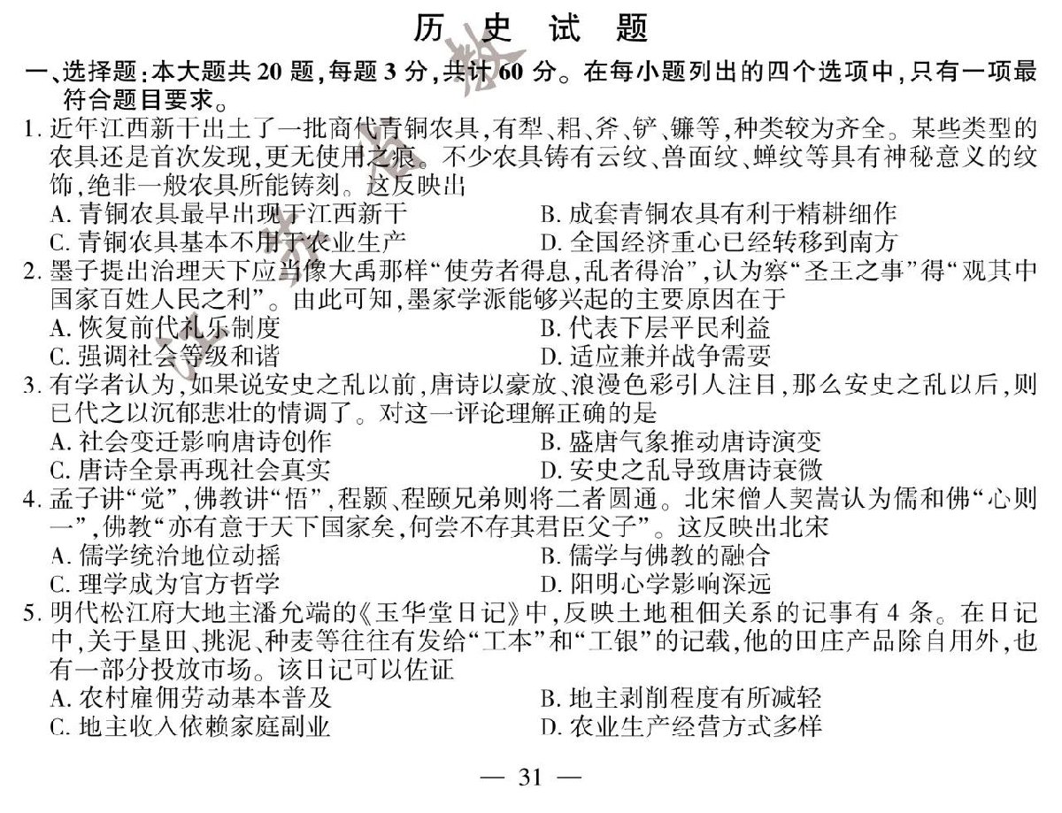 2020年江苏高考历史试题+参考答案:
