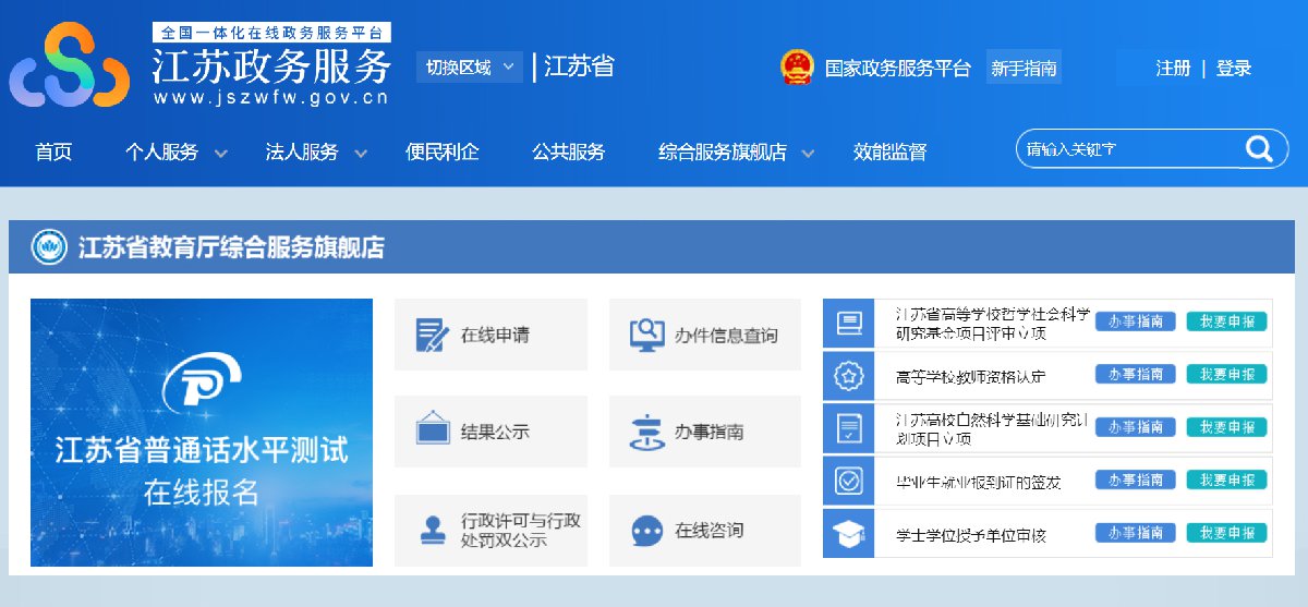 1.在江苏政务服务网首页,横向滚动菜单区域,或在“综合服务旗舰店——省教育厅旗舰店”中找到“江苏省普通话水平测试在线报名”,点击进入。