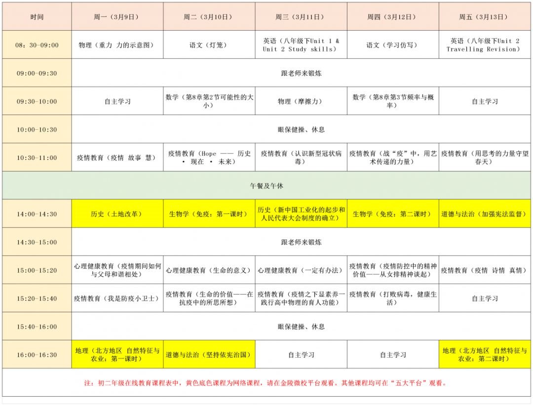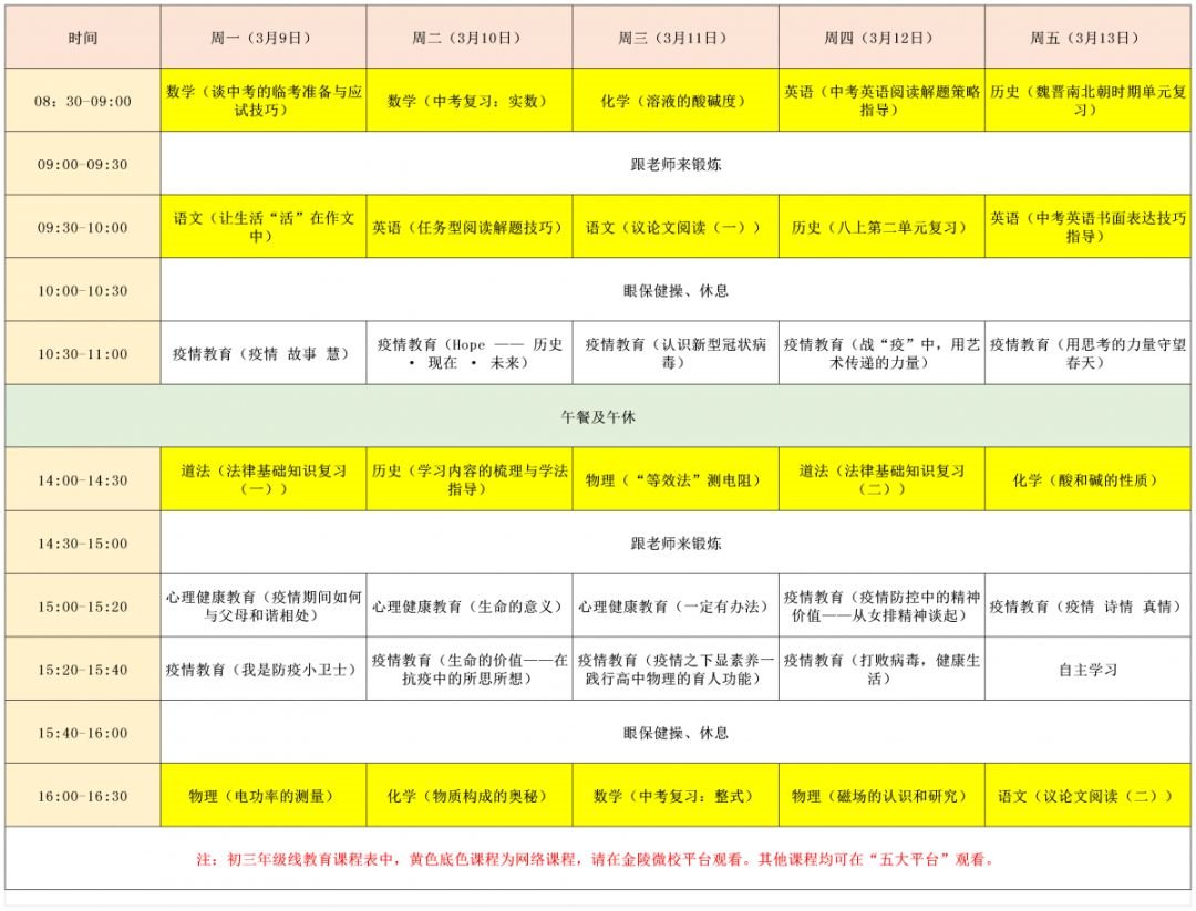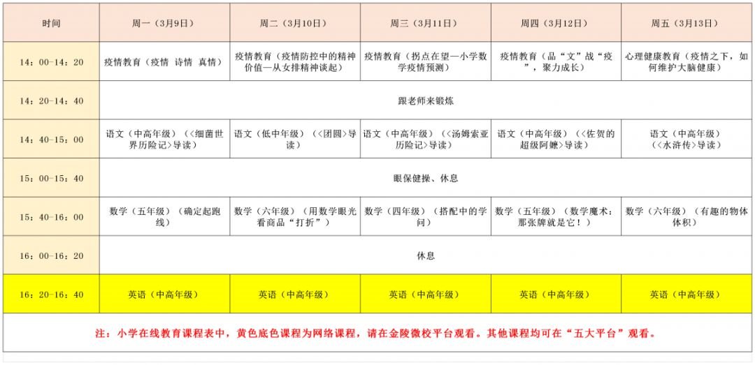 2020年3月9日至13日南京名师精品课堂小学+初中课表