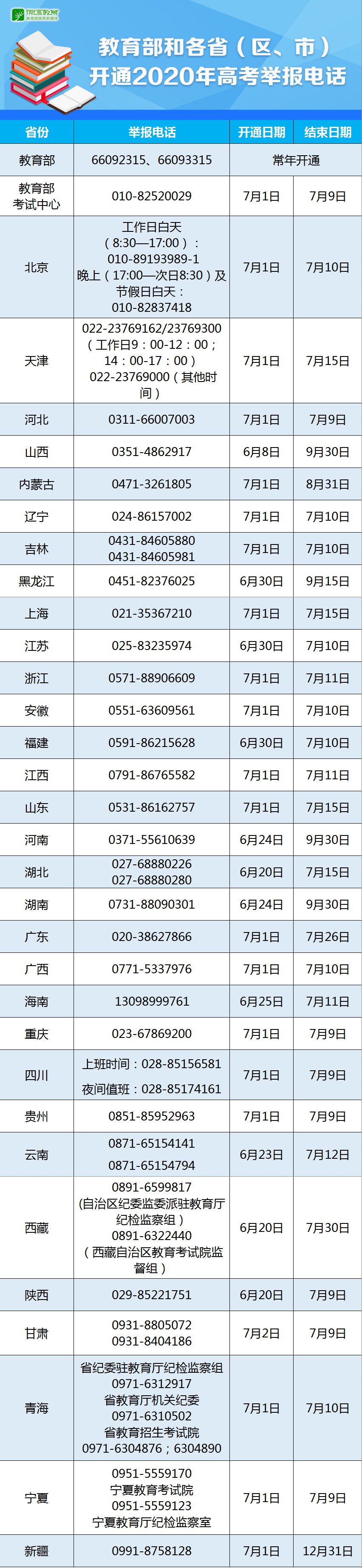 教育部已统一公布了教育部以及全国31个省(区、市)教育行政部门和招生考试机构2020年的高考举报电话,欢迎广大考生、家长及社会各界人士及时举报反映涉及2020年高考安全的线索。教育部及各省(区、市)将会同有关部门根据举报线索第一时间核查处理,坚决维护高考公平公正。