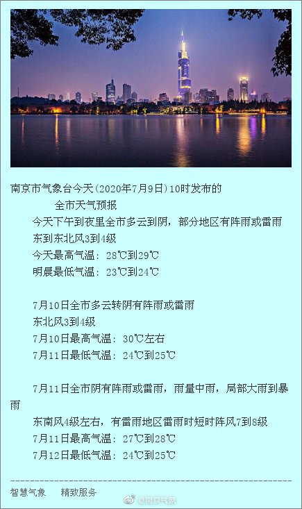 南京市气象台今天(2020年7月9日)10时发布全市天气预报: