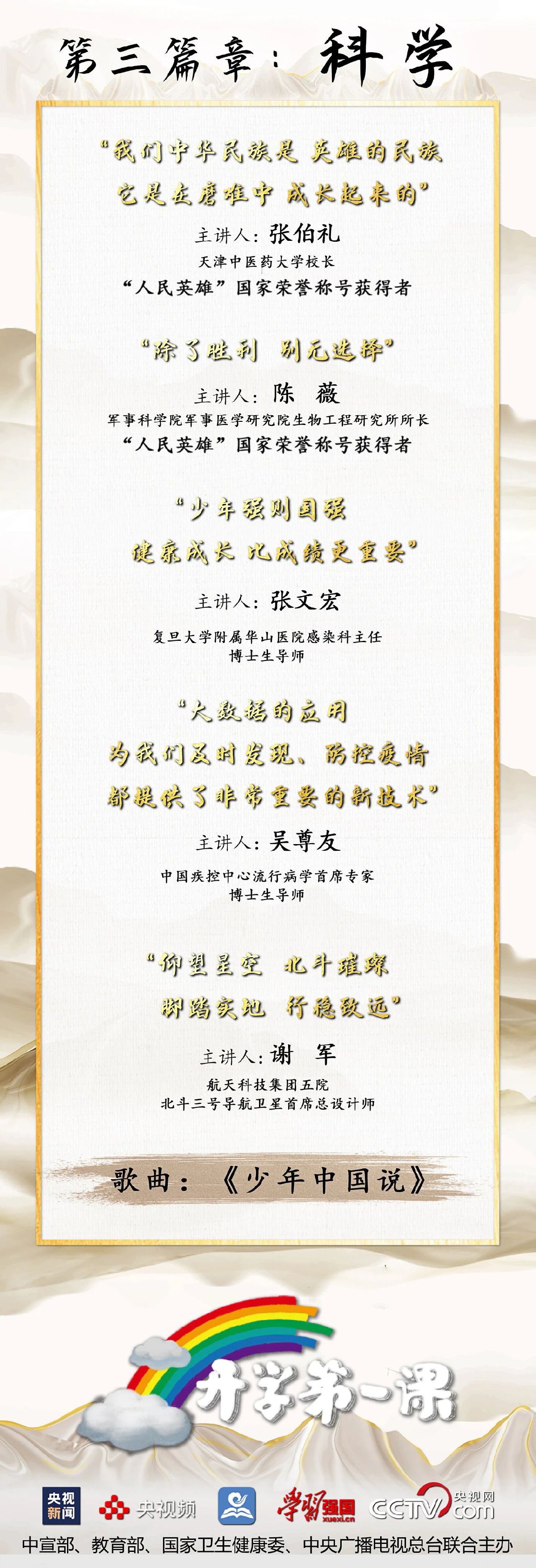 在这堂特殊的“第一课”上,你将见到在抗疫全民行动中最具分量的榜样人物和英雄代表,其中有“共和国勋章”获得者钟南山,有“人民英雄”国家荣誉称号获得者张伯礼、张定宇、陈薇,有陆军军医大学第一附属医院感染病科主任毛青、复旦大学附属华山医院感染科主任张文宏、中国疾控中心流行病学首席专家吴尊友、航天科技集团五院北斗三号导航卫星首席总设计师谢军。你还将见到奋战在抗疫一线的青年医护代表、坚守在不同岗位的平凡英雄、收获成长的青少年学生代表等。