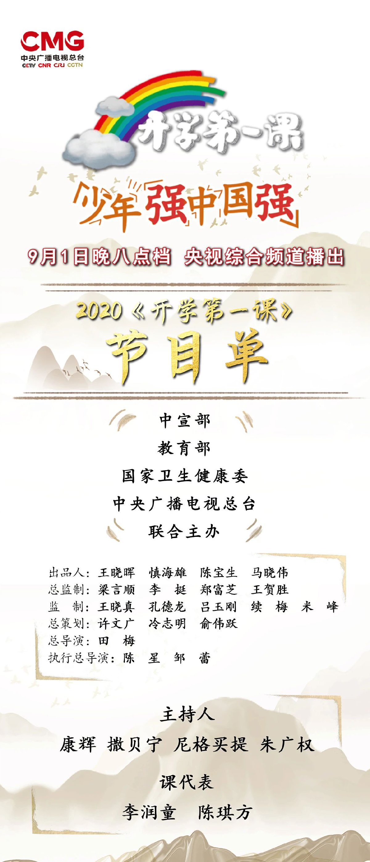 2020年《开学第一课》由中宣部、教育部、国家卫生健康委、中央广播电视总台联合主办。