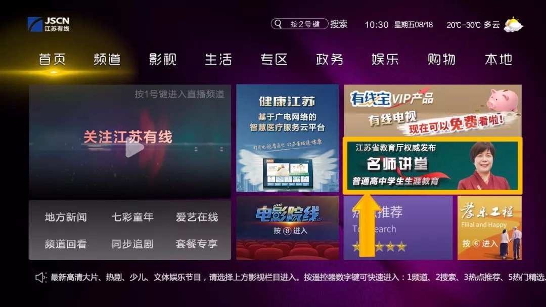 ②江苏有线紫色版新界面:在首页用遥控器按方向键选择“名师空中课堂”。