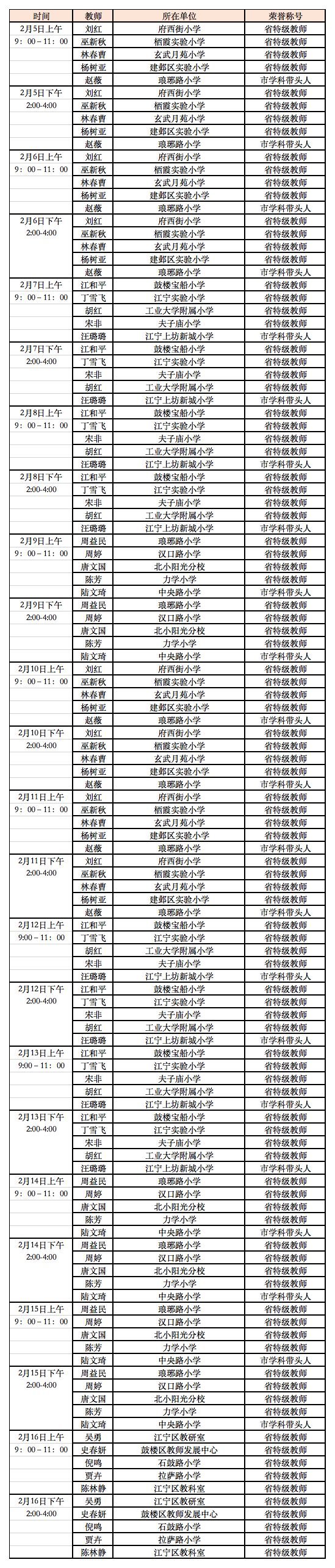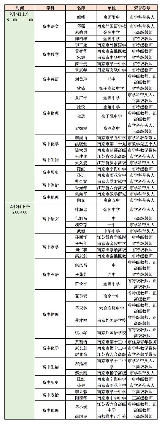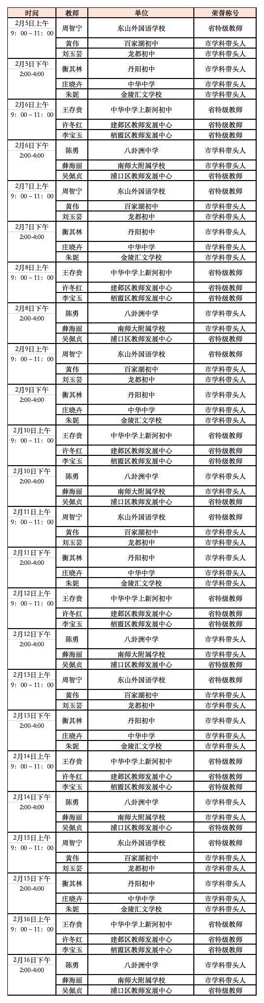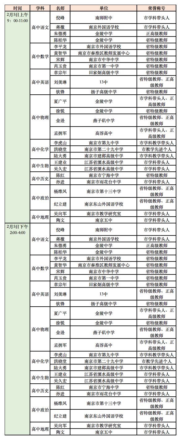 延期开学期间南京线上教育平台教师在线答疑值班表