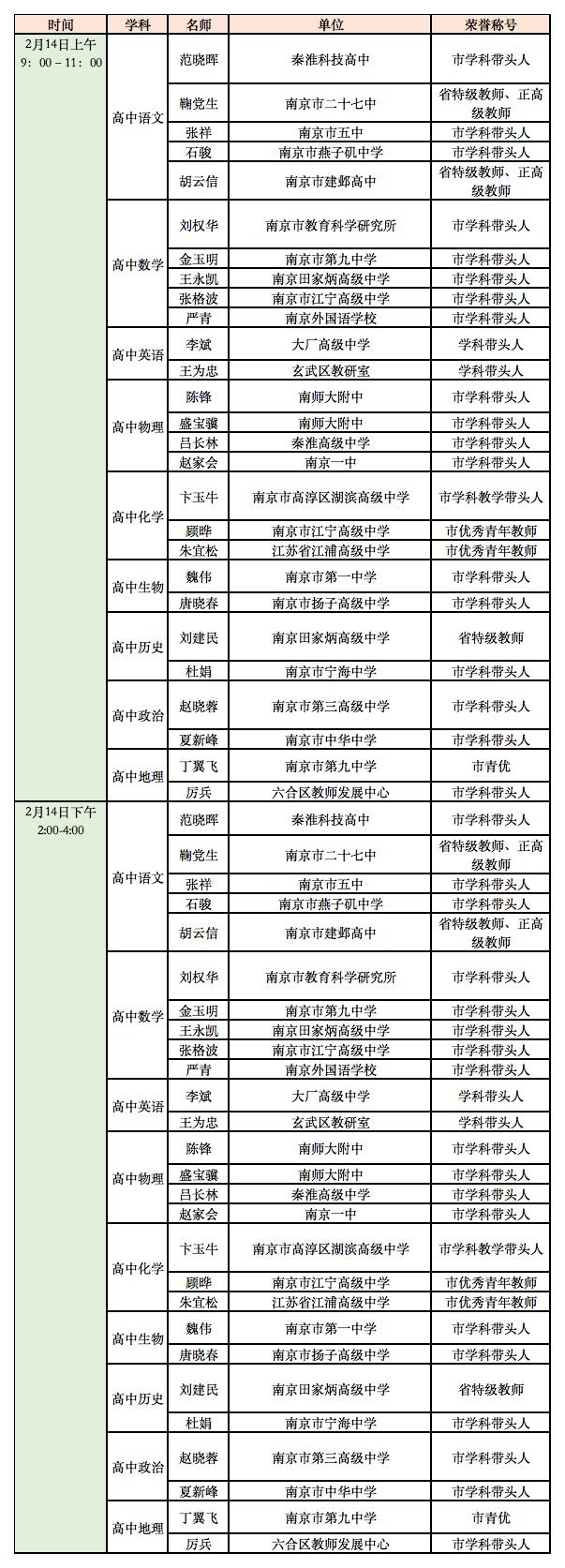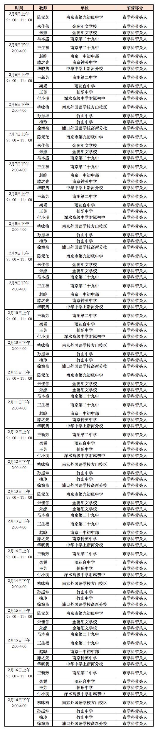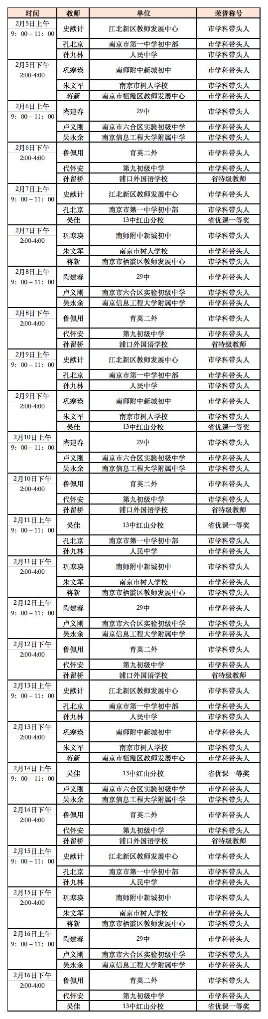 延期开学期间南京线上教育平台教师在线答疑值班表
